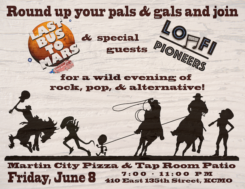 Last Bus to Mars will be landing at the Martin City Pizza & Tap Room Patio. Prepare your own landing party as we plan to light up the Summer sky with 90’s to current alternative, pop & rock! You won’t even have to stay up past your bed time.. unless you want to. Enjoy fantastic food, brews, friends & music. We’ll be sure to set our phasers to stun!
